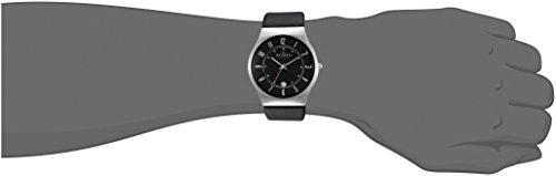 Genuine style. This men's watch with genuine black leather straps connect to a brushed stainless steel case. The shiny black dial features 12 chrome and white luminous numbered indicators, a 24-hour dial and date function above the six hour.