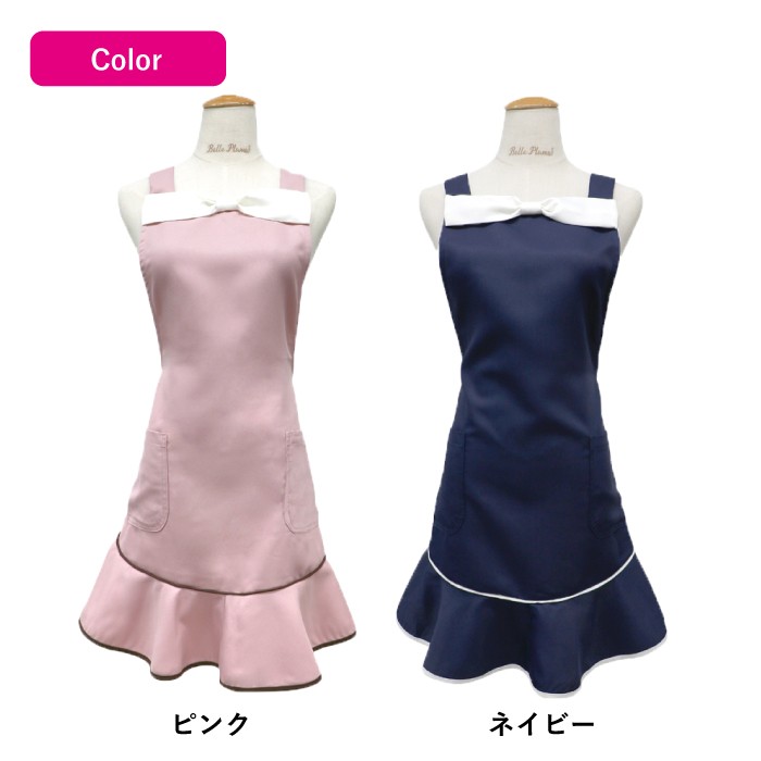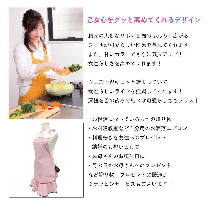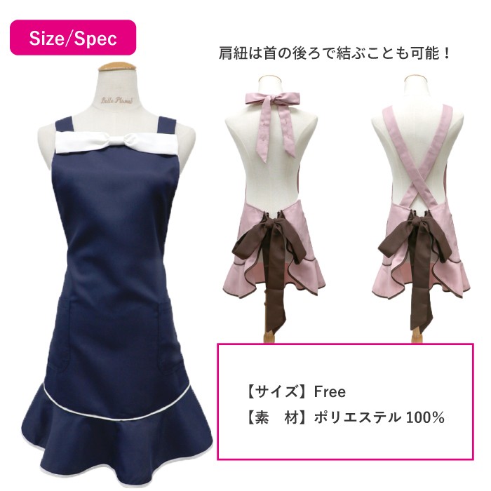 胸元の大きいリボンとふんわり広がるフレアが 乙女ココロをグッと高めてくれる おしゃれで可愛いワンピースエプロンです。 ■サイズ フリー 着丈(胸元から裾まで) : 約75cm  ウエスト : 約70cm 腰紐(片側) :約100cm ■材 質 ポリエステル100%
