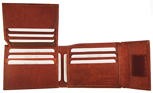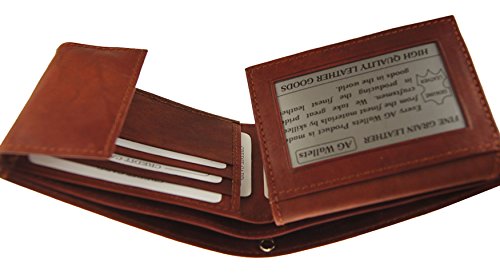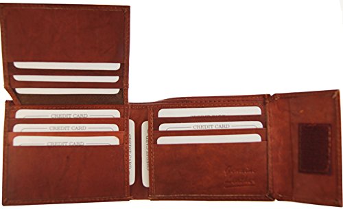 Product Description Genuine Leather Bifold wallet with flipup ID flap 2 currency pockets with hideaway zippered pocket, 9 credit card slots and it has Velcro closure 0