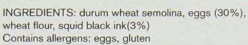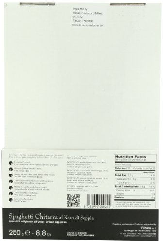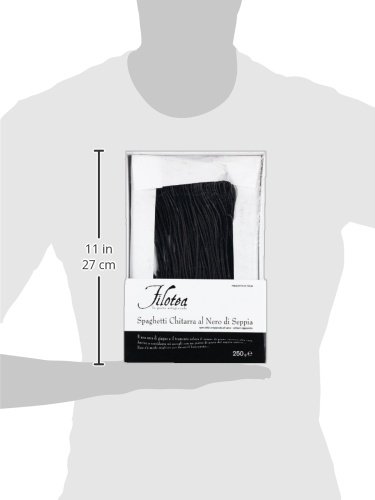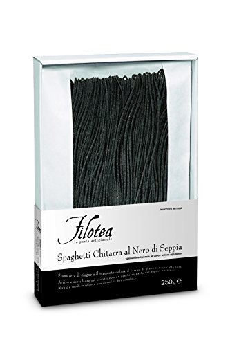 -. Binding : Grocery -. Brand : Filotea -. EAN : 8032993000295 -. Feature : Traditional handmade spaghetti alla chitarra mixed with squid ink. Cooking time: 3 minutes / Excellent visual impact and very delicate taste that pairs well with fish and seafood sauces / Bronze die manufacturing and slow drying process confer a rough and porous texture that preserves the taste and feel of fresh pasta. / All genuine ingredients: non-GMO, no additives, no preservatives / Artisan product of Italy -. IsAdultProduct : 0 -. Label : Italian Products -. Manufacturer : Italian Products -. Model : WF7330460 -. MPN : WF7330460 -. NumberOfItems : 1 -. PackageQuantity : 1 -. PartNumber : WF7330460 -. ProductGroup : Grocery -. ProductTypeName : GROCERY -. Publisher : Italian Products -. ReleaseDate : 2013-10-07 -. Studio : Italian Products -. Title : Filotea Egg Spaghetti Pasta, Black Squid Ink, 8.8 Ounce