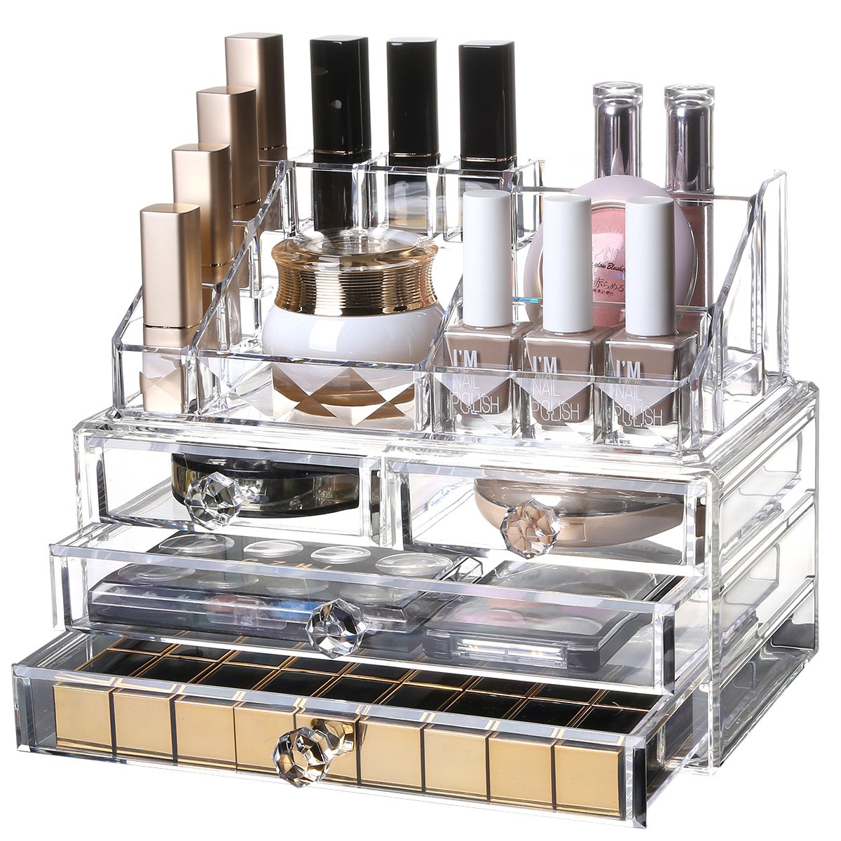 アクリルコスメ収納ボックスが登場します。高品質アクリル素材を採用しており、透明度は91%に達し、ガラスのような光沢が高級感を生み出し、2年内に変色しません。 収納ボックスの上段には大きさの異なる仕切りがあり、下段には引き出しが3つ付いており、機能性が高い、サイズ別でアイテムの整理が可能です。 一体成型で作ることで使用中に接合部から割れてしまうことが防止できます。角が丸い安心設計なので、お子様のいるご家庭にも安心です。 綺麗目の上品な雰囲気で、りピング・化粧台・洗面台・バスルーム、どんな雰囲気にもマッチします。 【ご注意】お手入れの際は、ネルのような柔らかい布で乾拭き又は水拭きしてください。洗剤の御使用は避けて下さい。