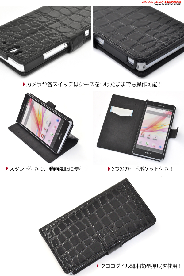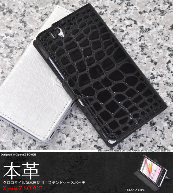 | クロコダイル調本皮(牛型押し革)を使用した、Xperia Z SO-02E用スタンドケースポーチ。 衝撃やキズなどからXperia Z SO-02Eを守ります。 また、内部にはプラスチックケースを備え、本体をしっかりと固定します。 背面を折り返すとスタンドとして使用できるので、動画視聴に便利です。 横開きタイプなので、手帳のように使うことができます。 また、内側に3つのカードポケットが付いています。 ※Xperia Z SO-02Eは付属しません。 ※ライセンス商品ではありません。 | ||||||||||