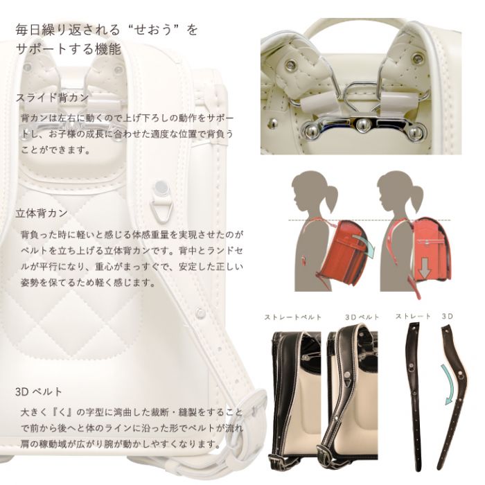 ◎배캔에게는 벨트가 입체적에 일어나 등으로 딱 피트 한다『윙배 캔』를 사용.이사에 의해란도세루(초등학생이 어깨에 매는 가방)의 중량을 분산시켜 실제의 중량 보다 가볍게 느끼게 하고, 아드님의 부담을 경감시킵니다.게다가(더구나),어깨 벨트가 좌우로 슬라이드 하는 기능도 갖춰지고 있습니다!!