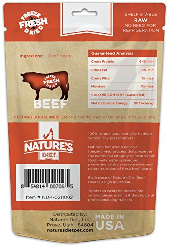 Dogs naturally crave meat. Nature's Diet 100% raw meat treats are a delicious and healthy training aid or reward for your furry friend. You can feed with confidence that our treats are all natural and free of additives, fillers and preservatives. Our Nature's Diet delicate freeze drying process removes only water and preserves all of the characteristics and natural nutrition of high quality, USA meat. Gluten and Grain free. Your pet will love the taste and you can rest assured that our treats are the safest way to feed raw meat.Feature