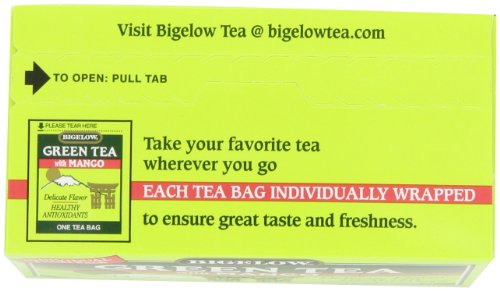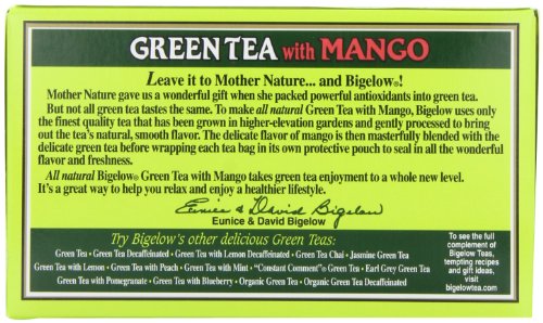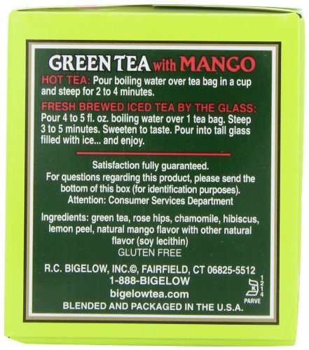 -. Binding : Grocery -. Brand : Bigelow Tea -. EAN : 0072310001879 -. Feature : Pack of six 20-count boxes of calorie-free green tea (120 total tea bags) / Delicate green tea flavored with mango / Gluten free, with no calories and no carbohydrates; Kosher Parve / An excellent source of healthy antioxidants / Ships in Certified Frustration-Free Packaging -. Label : Bigelow -. LegalDisclaimer : Actual product packaging and materials may contain more and different information than what is shown on our website. We recommend that you do not rely solely on the information presented and that you always read labels, warnings, and directions before using or consuming a product. -. Manufacturer : Bigelow -. Model : 7231000187 -. MPN : 072310001879 -. NumberOfItems : 6 -. PackageQuantity : 6 -. PartNumber : 072310001879 -. ProductGroup : Grocery -. ProductTypeName : GROCERY -. Publisher : Bigelow -. ReleaseDate : 2006-06-22 -. Size : 6 Pack -. Studio : Bigelow -. Title : Bigelow Green Tea with Mango, 20-Count Boxes (Pack of 6) -. UPC : 072310001879