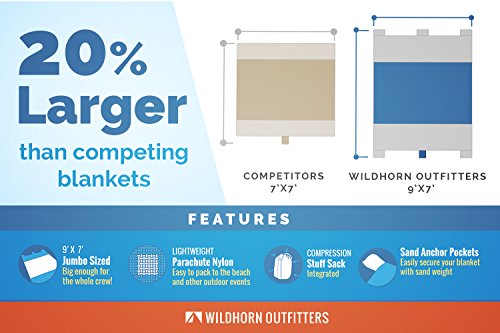 Sand Escape Compact Outdoor Beach Blankets / Picnic Blanket- 7' X 9' 20% Bigger Than Other Blankets. Made From Strong Ripstop Parachute Nylon. Includes Built In Sand Anchors & Valuables Pocket