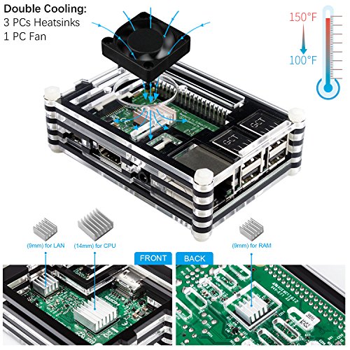 Double Cooling: For Raspberry pi 3 Case with Fan, spins quietly which keeps the CPU safe without overheating and 3pcs Aluminum Heatsinks improve the CPU/LAN/RAM chips ventilation.