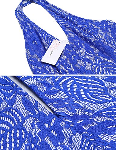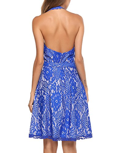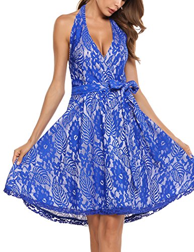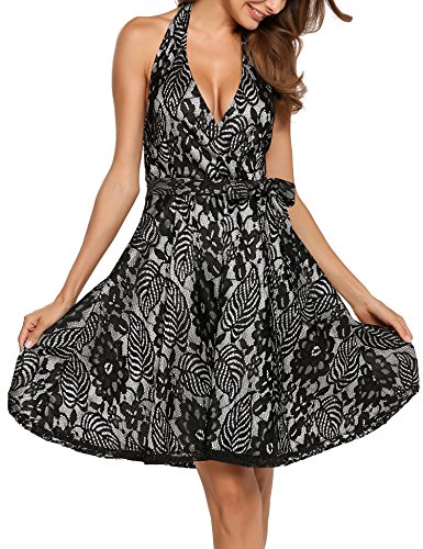 ACEVOG | Choose Us Embrace The Good ACEVOG Dresses: 1950s Vintage Style Sexy Deep V Halter Neck Knee Length Floral Lace Printed A-Line Dress With Sash / Waist Belt for Women Juniors