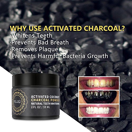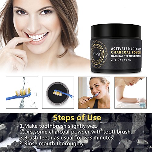 INDICATIONS: Melao Activated Charcoal Powder Teeth Whitener is an ideal natural alternative to whitening teeth. It aids in keeping teeth and gums healthy, and freshening breath. Made from 100% pure coconut shells, its nonabrasive formula binds stains on teeth resulting from coffee, tea or red wine, and gently removes them. It also targets plaque, aiding in preventing gum disease.