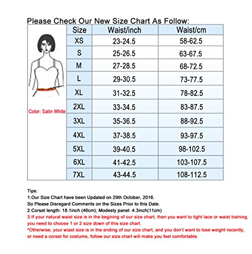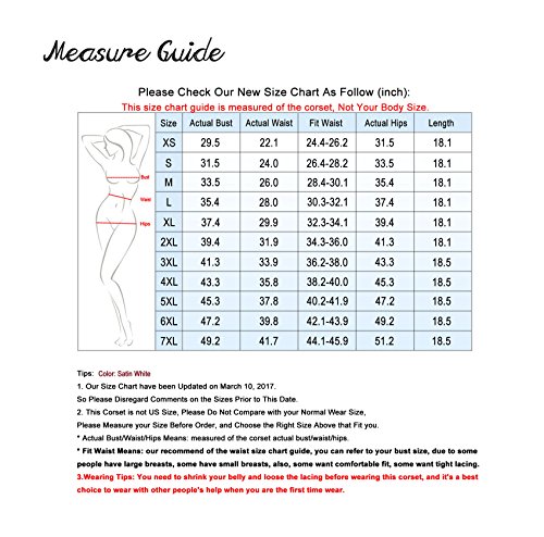 Binding : Apparel Product Description Women's Brocade Hourglass Bodyshaper Overbust Corset, Double Spiral Steel Boned for Supporting, Steel Busk Closure in Front, Lace-up in Back for Cinching. This Corset Draws in Waist and Flattens Tummy. Suitable for Waist Training, Tight-Lacing and Shaping. About Material 90 Polyester 10% Spandex About Spiral Steel Boning It's the Flexible and Durable Thin Steel Boned, NOT the Strong Thick Steel. Internal Flexible Boning Prevent the Garment from Rolling Up or Down. Spiral Steel Boned Waist Cincher, a Helpful Corset Gives a Slim Figure for you, an Ideal for a Hourglass Shape. Guide to Choose the Right Size The Size Chart Above is Measured of the Corset, NOT YOUR BODY SIZE. Please Measure your Size Before Order, and Choose the Right Size Above that Fit you. Corset is In Order to Make A More Slender Body, Please Don't Compare with the General Clothes' Size.About Size Chart Size Chart(cm) XS/Waist:56-59.5 cm S/Waist:61-64.5 cm M/Waist:66-69.5 cm L/Waist:71-74.5 cm XL/Waist:76-79.5 cm 2XL/Waist:81-84.5 cm 3XL/Waist:86-89.5 cm 4XL/Waist:91-94.5 cm 5XL/Waist:96-99.5 cm 6XL/Waist:101-104.5 cm 7XL/Waist:106-109.5 cm Size Chart(inch) XS/Waist:22-23.5 inch S/Waist:24-25.5 inch M/Waist:26-27.5 inch L/Waist:28-29.5 inch XL/Waist:30-31.5 inch 2XL/Waist:32-33.5 inch 3XL/Waist:34-35.5 inch 4XL/Waist:36-37.5 inch 5XL/Waist:38-39.5 inch 6XL/Waist:40-41.5 inch 7XL/Waist:42-43.5 inch Due to manual measurement, please allows 1-3(cm) deviation. The real color of the item may be slightly different from the pictures shown on website caused by many factors such as brightness of your monitor and light brightness. 0