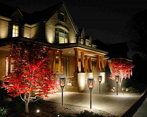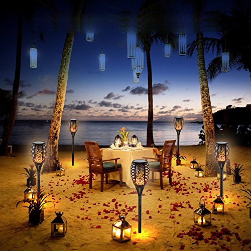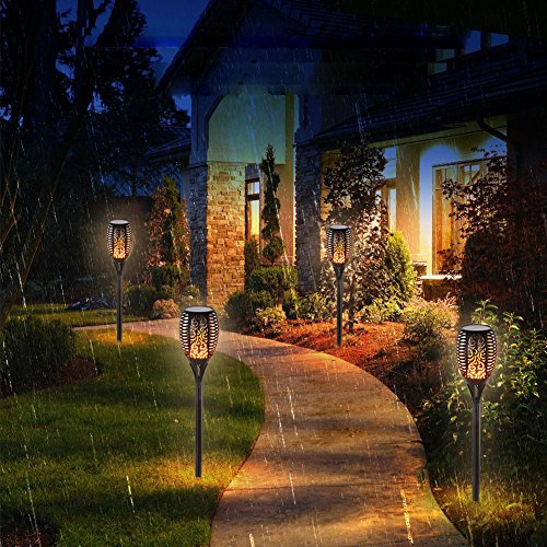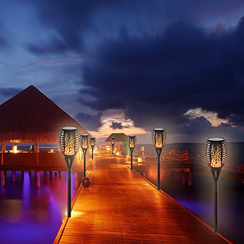 - DANCING FLAM LAMP:The solar torch light have 96 LEDS,each IP65 waterproof LED flickers warm yellow lights,dozens of change of flame,mimic extremely realistic & natural dancing flames.