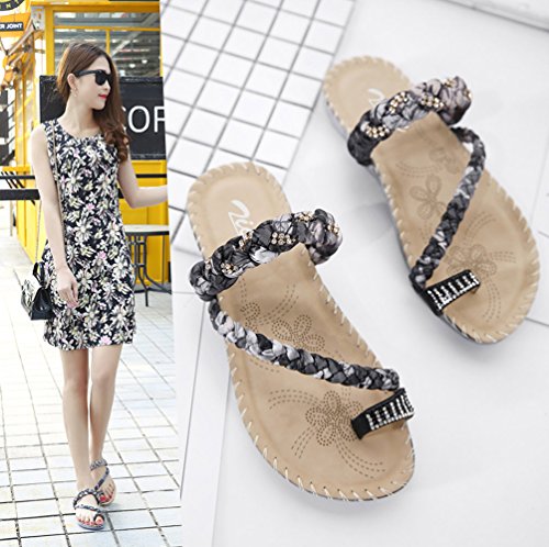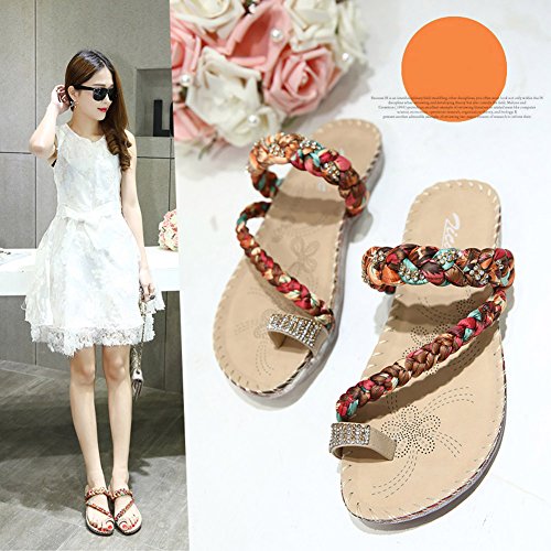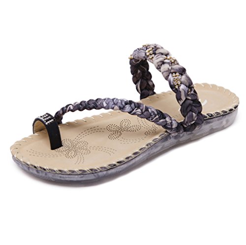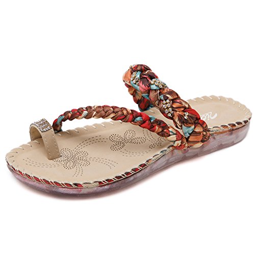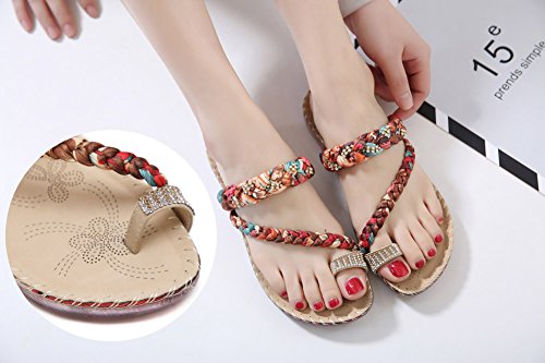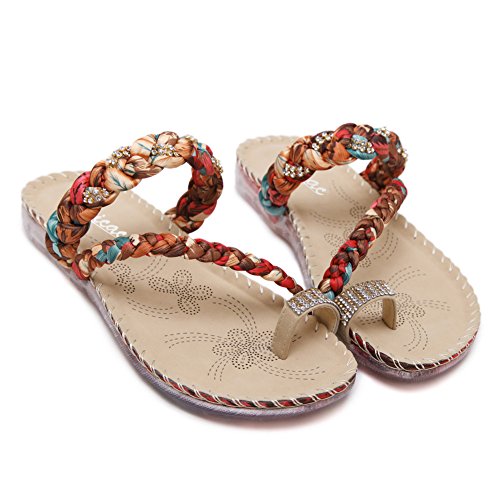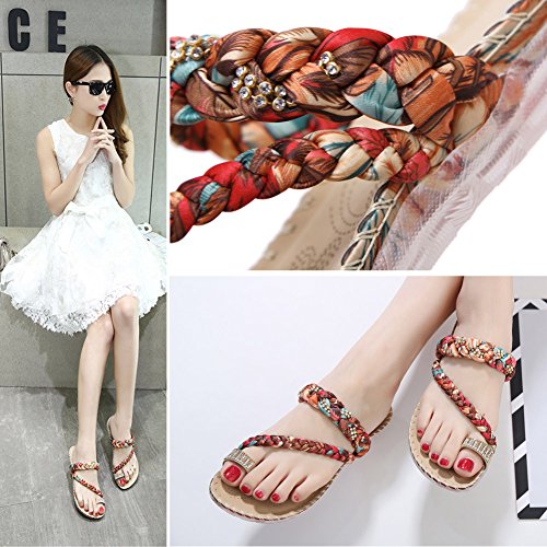 Binding : Apparel Product Description Outer Material: Rubber Inner Material: microfiber Heel Type: Flats Heel height: about 2cm (0.8") Platform: about 1.5 cm (0.6") Design: soft padded comfortable sole, glittering decorative rhinestone beads, delicate woven ankle straps Perfect for summer holiday vacation. Size: 37,38,39,40,41,42 (Asia) 37:US5 foot length: 231-235mm 38:US6 foot length: 236-240mm 39:US7 foot length: 241-245mm 40:US8 foot length: 246-250mm 41:US9 foot length: 251-255mm 42:US10 foot length: 256-260mm Package: 1x Sandals 0 |