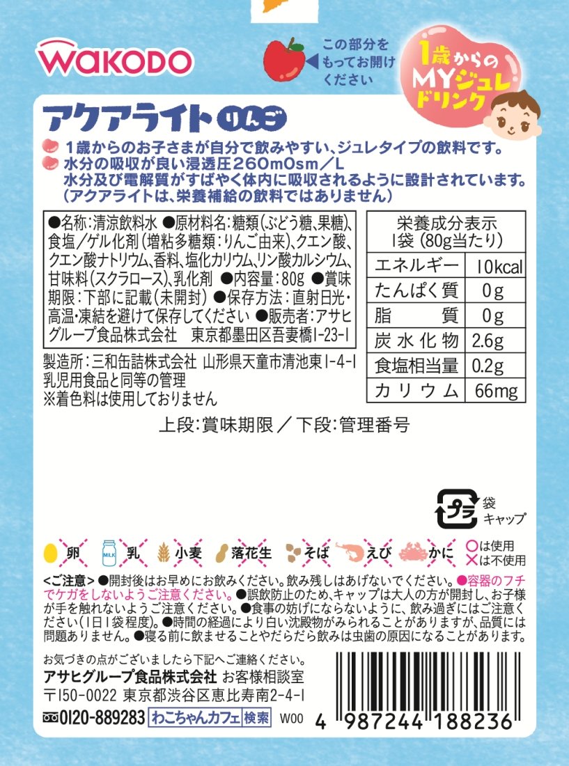 Energy 10 kcal per 80 g of bag, protein 0 g, lipid 0 g, carbohydrate 2.6 g, sodium chloride equivalent amount 0.2 g, potassium 66 mg