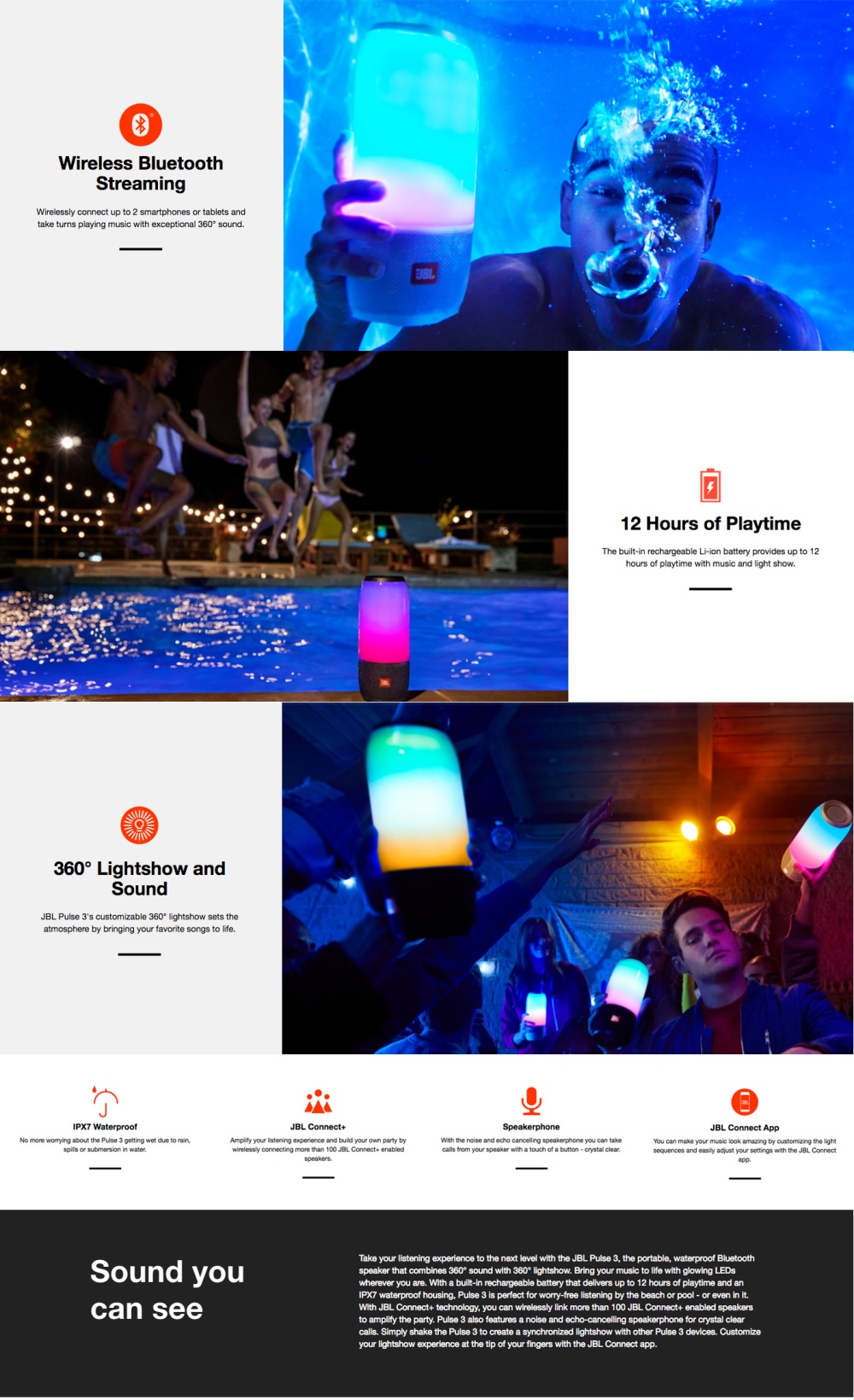 Take your listening experience to the next level with the JBL Pulse 3, the portable, waterproof Bluetooth speaker that combines 360° sound with 360° lightshow. Bring your music to life with glowing LEDs wherever you are. With a built-in rechargeable battery that delivers up to 12 hours of playtime and an IPX7 waterproof housing, Pulse 3 is perfect for worry-free listening by the beach or pool – or even in it. With JBL Connect+ technology, you can wirelessly link more than 100 JBL Connect+ enabled speakers to amplify the party. Pulse 3 also features a noise and echo-cancelling speakerphone for crystal clear calls. Simply shake the Pulse 3 to create a synchronized lightshow with other Pulse 3 devices. Customize your lightshow experience at the tip of your fingers with the JBL Connect app.
