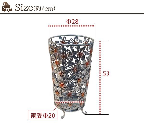 fk094igrjsお花の模様が可愛らしい傘立て雨受は取り外し可能でお手入れも簡単ですサイズ(約)Φ28×高さ53cm、雨受:Φ20cm個装サイズ:31×31×56cm重量約1.3kg個装重量:1400g素材・材質アイアン(シルバーラッカー塗装)仕様完成品雨受取り外し可能製造国中国お花模様がかわいいアイアン製傘立てお花の模様が可愛らしい傘立て雨受は取り外し可能でお手入れも簡単です