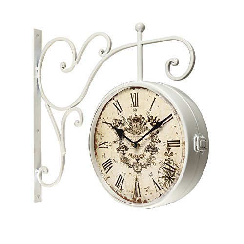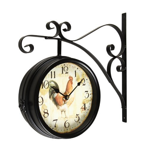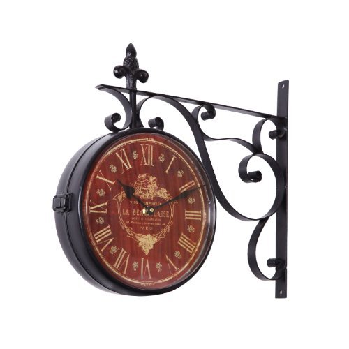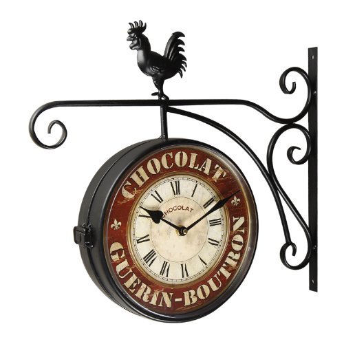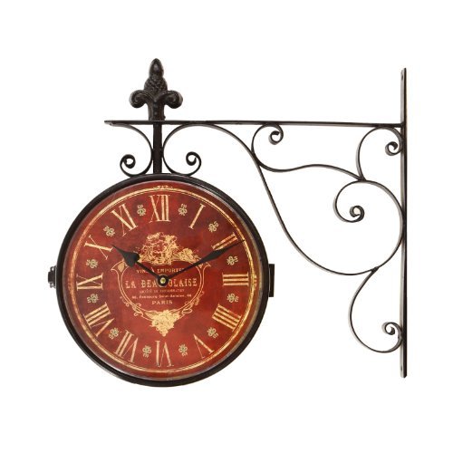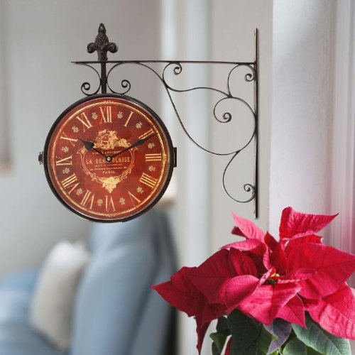 This beautiful clock with a scrolled wall mount topped by a fleur de lis is inspired by the antique clocks that hang in train stations. It features a detailed central design surrounded by large, gold roman numerals on a rich, red background. Small, stylized designs are interspersed between each number. This clock looks lovely on a kitchen or living room wall and makes a wonderful housewarming, wedding or anniversary gift.Feature