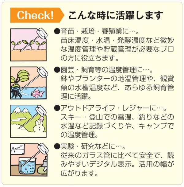 ガーデニングや観賞魚の水槽温度管理、実験・研究など、様々なシーンでお使い頂けるペン型温度計。-45度から200度までの広範囲の測定が可能で、表示部は便利な角度自在(180度)の首振りヘッド。また、ワンタッチで測定データを固定表示できる「測定データホールド機能」付き!! |