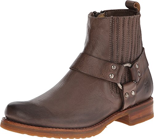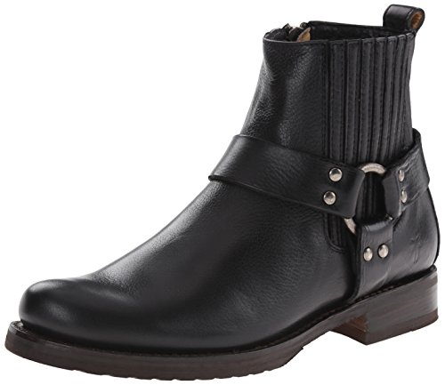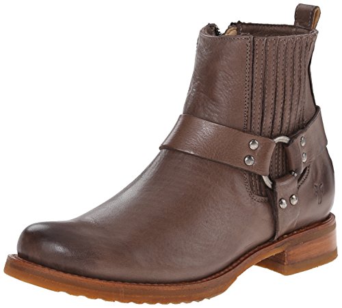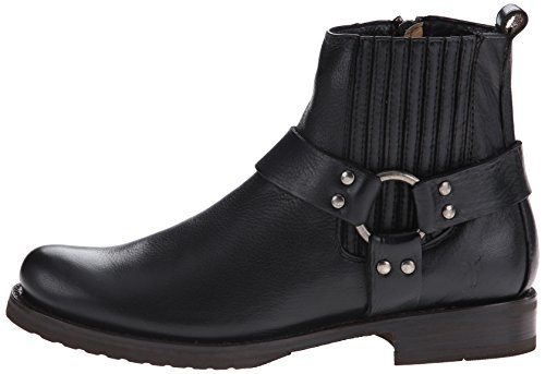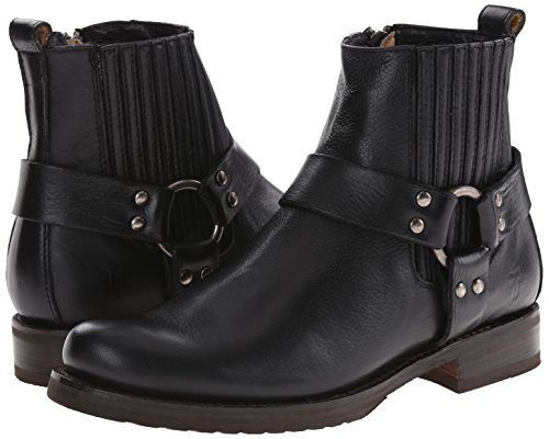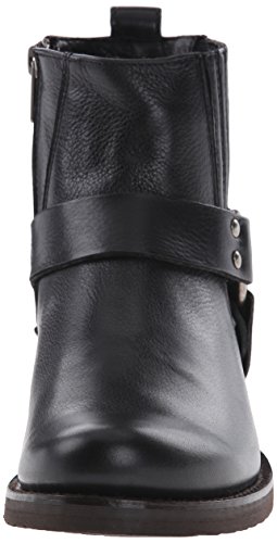 Leather ankle boot featuring pleated sides and harness strap with silver-tone hardware