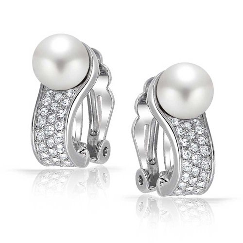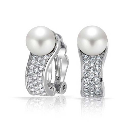 For that elegant, exquisitely refined look, choose these brass, clip on pearl earring, for non - pierced ears. Glistening, simulated 8mm pearls rest above a plane of dazzling, pave crystals.