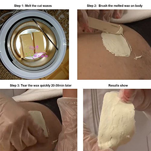-. Feature : Advance temperature control ( thermostatic heating) , stop heating when reach a certain temperture. Heating time about 30 minutes. / Heater for all wax,include hair removal wax, solid wax, paraffin hand wax, beauty wax,etc. / Wax Spa function:supplement skin oil, absorb quickly and form a natural protective film,improve rough dry skin,create long-term moisture skin (face, arm, leg , feet , ect). / You can use this heater to melt varies waxes (waxes for hand, leg, face, the back of body, axilla,etc). Waxes do not provide. / Please note : 1.- Do not use/storage it in wet places, like bathroom 2.- Can not use any power cord extending 3.- Cut off the electric when not use or when get water in 4.- Damaged skin can not use wax (varicose veins, abscesses, injuried, sunburn, skin irritation, and so on) 5.- Within 24 hours of hair removal do not bathe nor under sunshine too long.