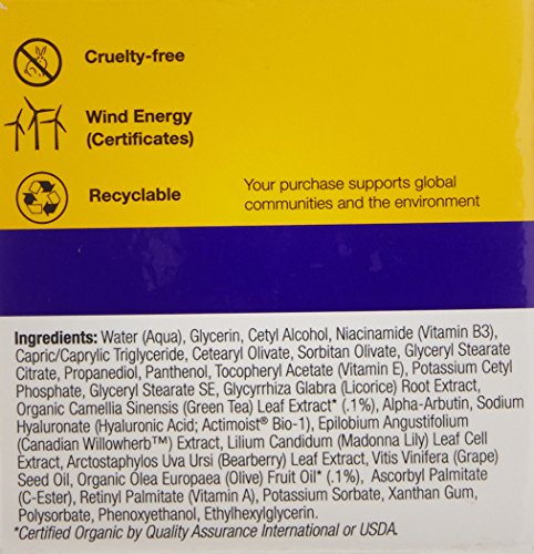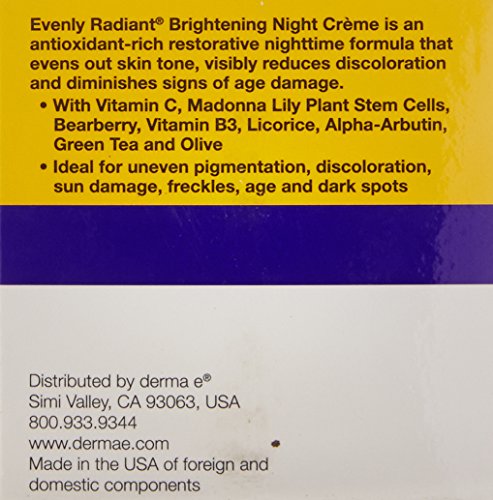 ReleaseDate : 2015-07-09 Studio : Derma E Publisher : Derma E Binding : Health and Beauty Product Description Derma E Evenly Radiant Night Creme Description: Natural Solution: Age Reverse. Intensive Skin Brightening Complex with Madonna Lily. Brightens and Evens Skin Tone. Skincare Solutions. Cruelty-Free. Paraben-Free. Evenly Radiant Night Creme is a citrus scented night time moisturizer with Madonna Lily, Alpha-Arbutin, Bearberry, Niacin amide and Licorice that helps lighten and prevent discoloration for more evenly-toned, brighter skin. Vitamin C, Green Tea and Olive deliver antioxidant benefits to help fight, reduce and prevent the visible signs of aging. Ideal for those with uneven pigmentation, sun damage and freckles. Derma e is family owned and operated. Proven natural formulations since 1984 Cruelty-free/gluten-free/vegan/pH balanced Never any harmful parabens, phthalates, sulfates, petrolatum, mineral oil or artificial colors. Free Of Animal cruelty, gluten, parabens, phthalates, sulfates, petrolatum, mineral oil and artificial colors. Disclaimer: These statements have not been evaluated by the FDA. These products are not intended to diagnose, treat, cure, or prevent any disease. 0