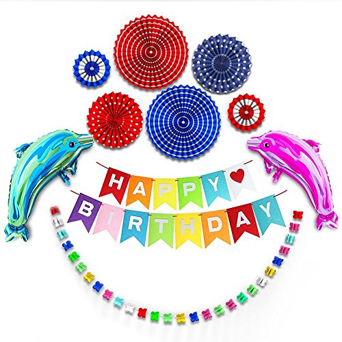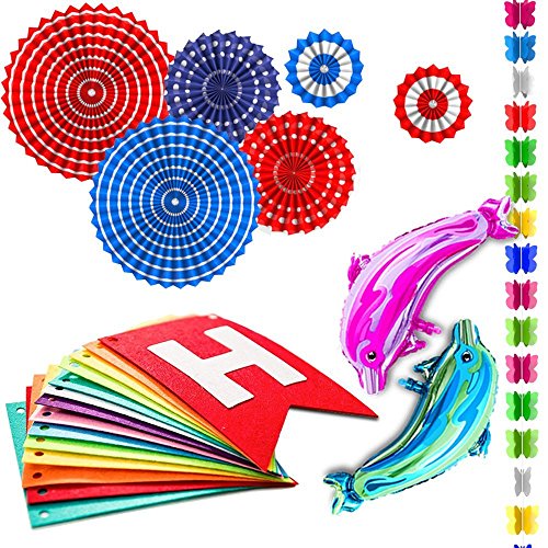 -. Feature : MAKE YOUR PARTY UNIQUE - Add a perfect touch to your Birthday Party with our beautiful decoration kit which includes 1 Happy Birthday Banner, 6 Paper Fan Flowers, 1 Colorful Paper Butterfly Garland and 2 Inflatable Dolphins. These bright and vivid color decorations will make birthday party planning easy and help create a warm and inviting party venue / HAPPY BIRTHDAY CARD - There are 14 cards, each card is approx. 21.5 cm/ 6.9 inches in length, 16 cm/ 4.9 inches in width and made from high quality durable felt textile material, it can be used both indoors and outdoors, and is totally reusable with its long-lasting colors. Comes with 13.8 ft red strand and a plastic needle which make assembly easy / 6 PAPER FAN FLOWERS - Includes 6 Hanging Paper Fan Flowers which bring some romantic atmosphere to your party, simply unfold the fans, hang on a wall, a tree, the ceiling or clustered together to coordinate with other hanging pom pom decorations, tissue flower garland, party streamers and other papel picado banner fiesta decorations. With a diverse array of sizes that include 7.9", 5.9" and 3.9" with colors ranging from red, blue and purple / BUTTERFLY GARLAND&INFLATABLE DOLPHIN - Package includes a 6ft Colorful Paper Butterfly Garland and 2 Inflatable Dolphins, the dolphins will come flat, you can use a straw to blow it. The size when inflated will be approximately 27.5"*11.8"*7.9" / WHAT YOU GET - 1 x Happy Birthday Banner, 6 x Paper Fan Flowers, 1 x Paper Butterfly Garland, 2 x Inflatable Dolphins, 18 Months Warranty & Friendly Customer Service. We are committed to give all customers an excellent shopping experience, if you have any questions or troubles, please feel free to contact us, we will reply you within 12 hours and do our best to achieve 100% in customer satisfaction