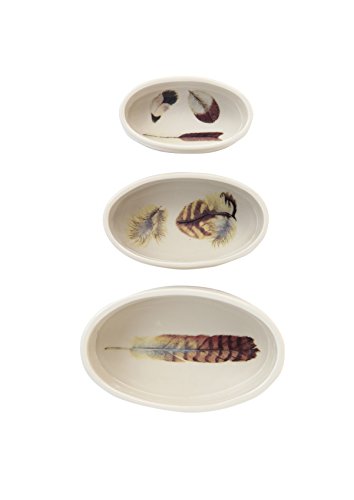 Creative Co-op DA6104 Stoneware Oval Ramekin Set with Feathers, Multicolor