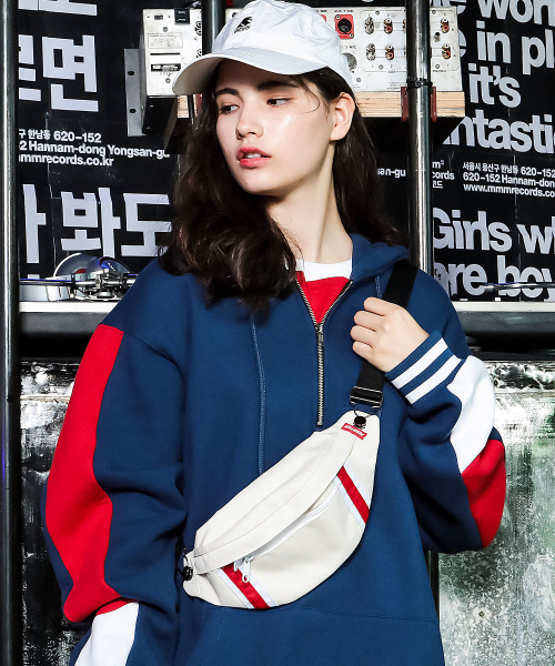 솔리드 웨이스트 백 - 솔리드 웨이스트 백은 전면에 배색 웨빙끈과 라벨로 포인트를 준 제품입니다.