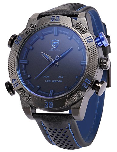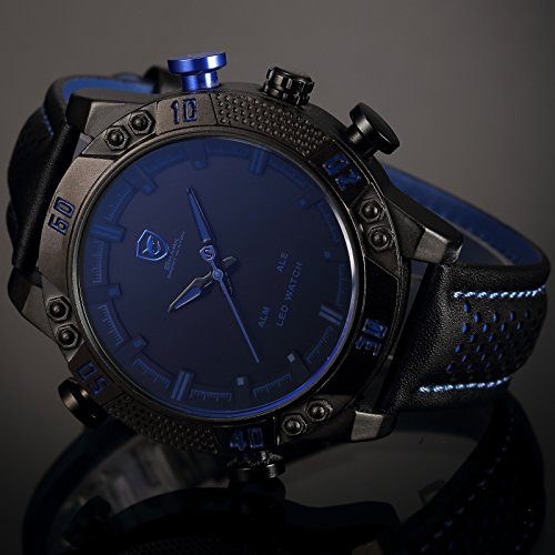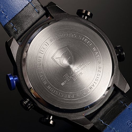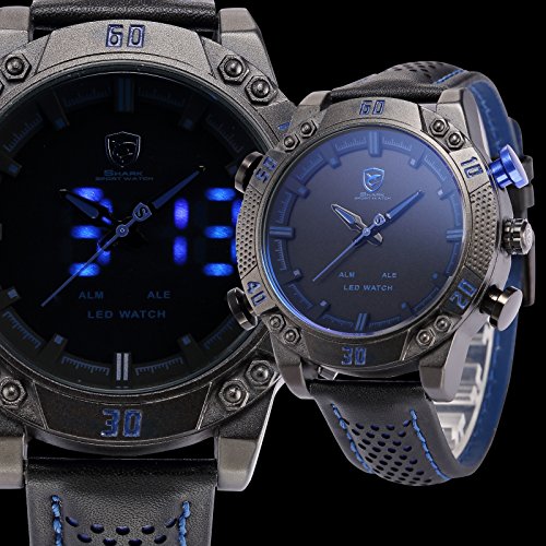 Shark Mens LED Date Day Alarm Digital Analog Quartz Sport Black Leather Band Wrist Watch SH265 Blue