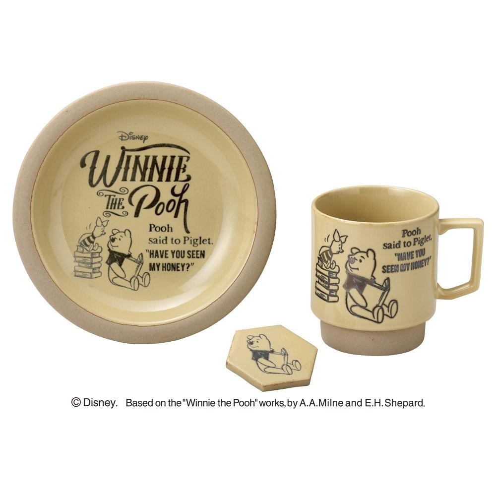 | 色土のナチュラルな風合いがプーさんたちの住む100エーカーの森を想わせるテーブルウェアセット。色釉薬ににじんだようなプリントが素朴な味わいで、リラックスしたティータイムを演出します。 |