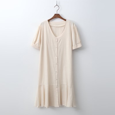 브이넥 네크라인 덕분에 더욱 여성스러운 린넨 퍼프 드레스.