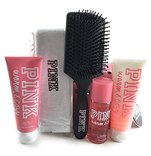 -. Feature : Victoria's Secret PINK Gift Set Warm & Cozy / Zip top cosmetic bag: 9"L x 5"W x 5"H / Warm & Cozy Body Mist: 75 ml/2.5 fl. oz., Warm & Cozy 2-in-1 Wash & Scrub: 100 ml/3.4 fl. oz., Warm & Cozy Body Lotion: 100 ml/3.4 fl. oz. / Hair brush, Headband / Set comes with 6 pieces total