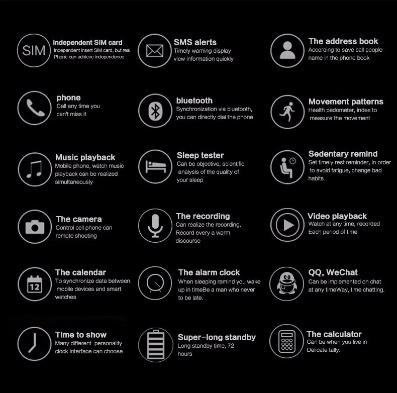 Function:Passometer,Sleep Tracker,Message Reminder,Call Reminder,Answer Call,Dial Call,Remote Control,Push Message,24 hour instruction,Chronograph,Alarm Clock,Permanent Calendar,Week,Month,Interactive Music,Calendar