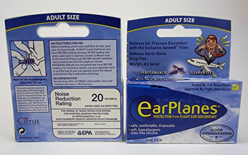 -. Feature : EarPlanes Relieve Ear Discomfort, Clogging, And Popping By Naturally Filtering and Regulating Air Pressure. / EarPlanes Are A Must Have For Your Next Trip: They Are Essential For Your Carry-On Bag! / EarPlanes Are Safe, Soft, And Disposable - Made From Soft Hypoallergenic Silicone. / EarPlanes Are Doctor Recommended, Tested By U.S. Navy Pilots, And Backed By The Good Housekeeping Seal! / Adult 1-Pair - One Pair Is Good For A Round Trip (2 Flights)