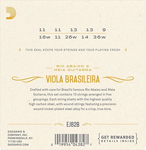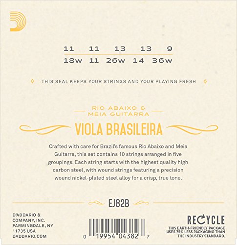 Studio : D'Addario Co. Inc Publisher : D'Addario Co. Inc Binding : Electronics Product Description D'Addario EJ82B Viola Brasileira strings are manufactured from nickelplated steel wound strings and tin plated plain steels, optimized for Rio Abaixo and Meia Guitarra. D'Addario offers a wide variety of ethnic instrument strings designed to the exacting specifications of our artists, instrument parterns and international customers. Our computer-controlled winding machinery, laser micrometer inspection, and closed-loop tension control systems promise unrivaled quality and consistency, set after set. 0