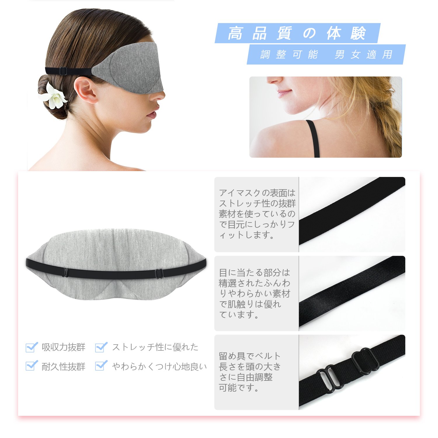 後ろのヘッドバンドは調整可能のタイプですので、顔と頭の大きさに関わらず、細かいデザインで、目元と耳に圧迫することはありません。ヘアへの影響も最小化に抑えます。日常の睡眠時はもちろん、夜行バスや飛行機などの移動時にも活用できます。ポーチも付いていますので、使わない時はコンパクトに収納できます。プレゼントとしても喜ばれるアイテムです。