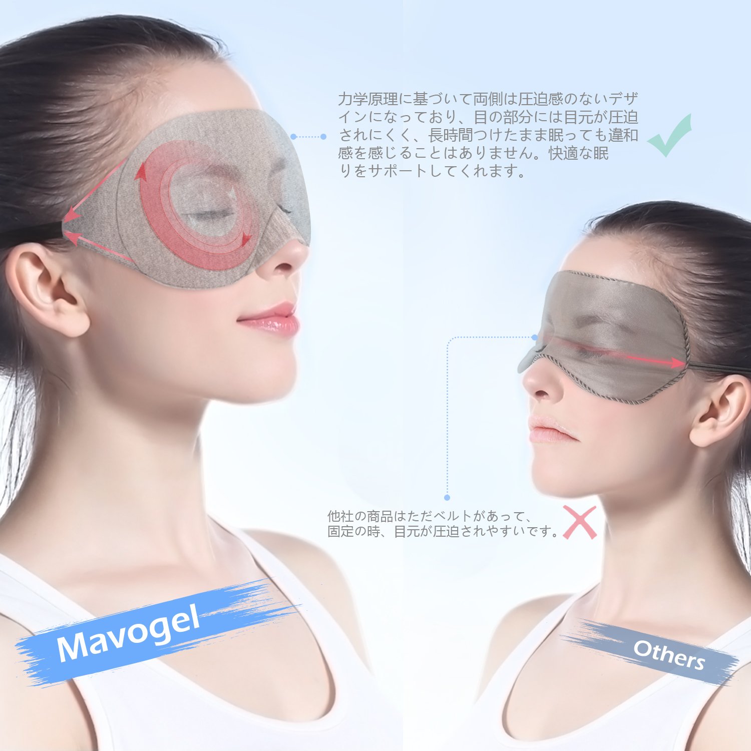 安眠アイマスクの両側は圧迫感のない滑り止めデザインですので、目元は圧迫せずに顔にしっかりフィットします。軽くて長時間つけたまま眠っても違和感を感じることはありませんので、安眠できます。