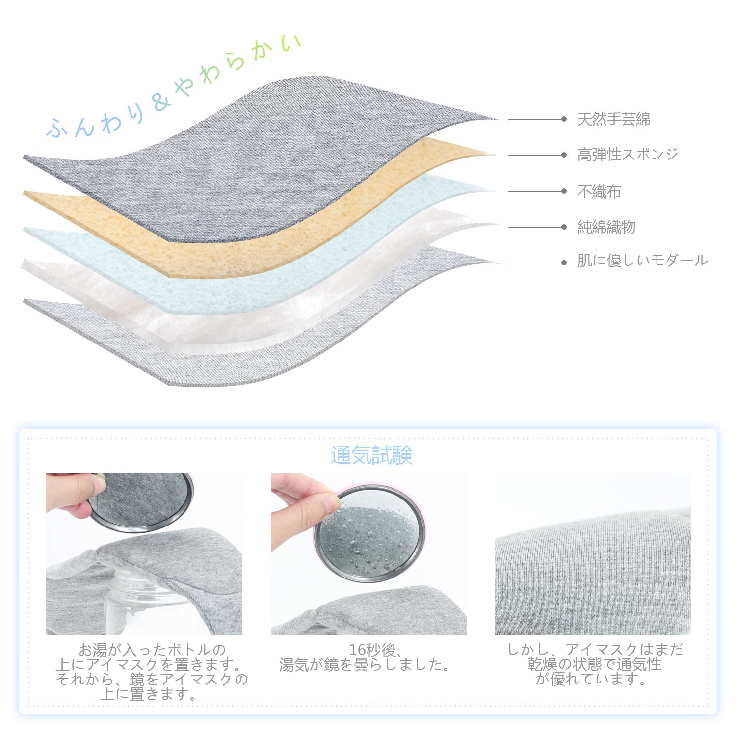 精選された天然手芸綿、高弾性スポンジ、不織布、純綿織物、肌に優しいモダール素材で、柔らかくてつけ心地は抜群ですし、通気性もいいので蒸れにくく肌に負担がかかりません。