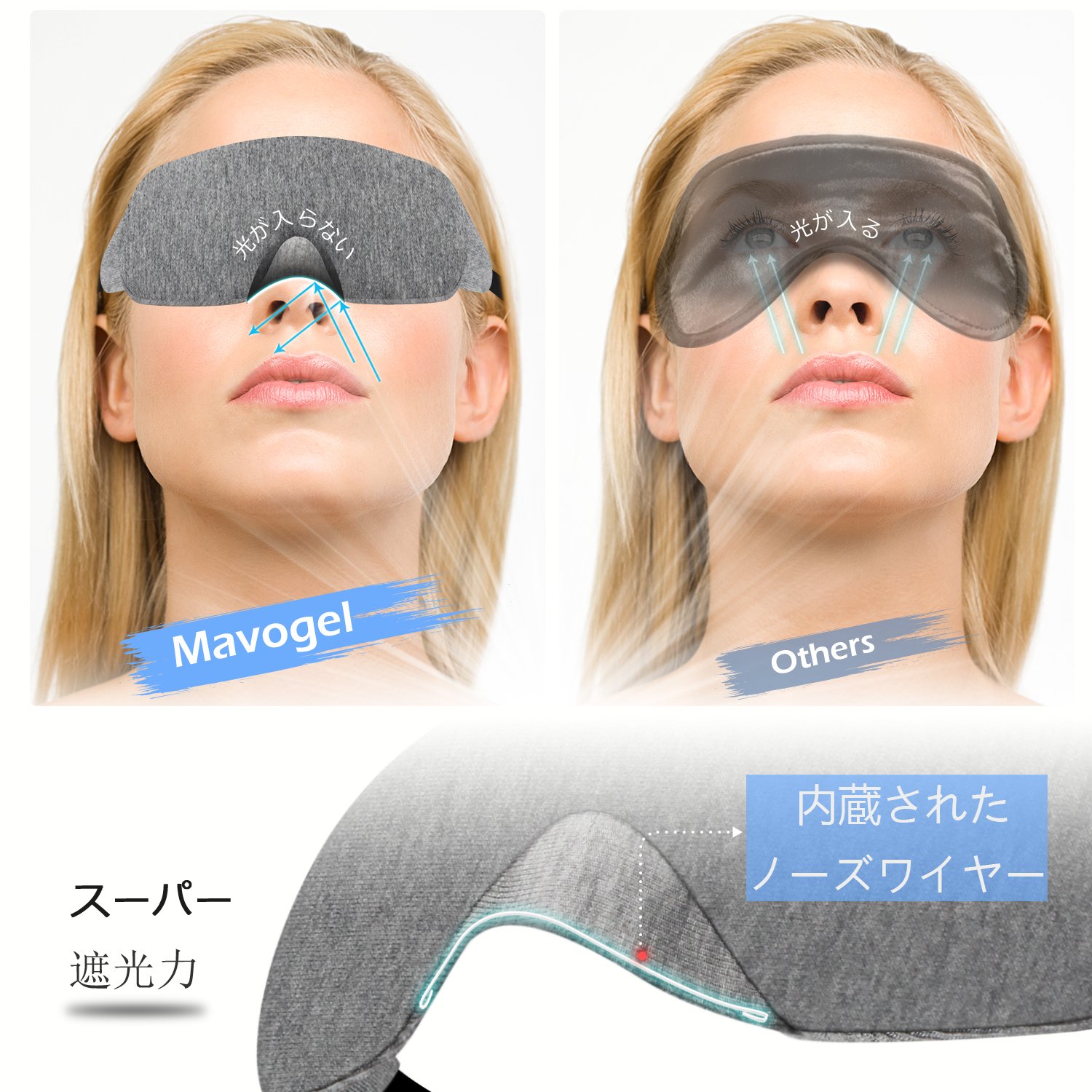 スーパー遮光力の安眠アイマスクです。人間の鼻の構造を細かく分析して商品の鼻の部分にノーズワイヤーが内蔵されて、着用の時、自由調節可能です。目と鼻の形にぴったり合うようなデザインになっており、快適な眠りをサポートしてくれます。