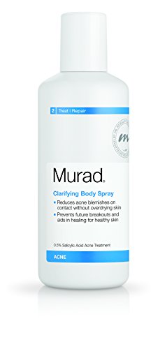 -. Binding : Health and Beauty -. Brand : Murad -. Color : white -. Department : womens -. EAN : 0882194308625 -. Feature : Clears and prevents blemishes and skin breakouts / Heals and keeps skin healthy / Powerful anti bacterial ingredients purify and clarify skin from head to toe / Salicylic Acid penetrates pore to clear up acne / Skin conditioners soothe and hydrate irritated skin -. HazardousMaterialType : Unknown -. IsAdultProduct : 0 -. IsAutographed : 0 -. IsMemorabilia : 0 -. Label : Murad -. LegalDisclaimer : This product can only be shipped to : United States -. Manufacturer : Murad -. Model : 10160 -. MPN : MUR-071 -. NumberOfItems : 1 -. PackageQuantity : 1 -. PartNumber : MUR-071 -. ProductGroup : Beauty -. ProductTypeName : BEAUTY -. Publisher : Murad -. ReleaseDate : 2006-06-16 -. Size : 4.3 oz. -. Studio : Murad -. Title : Murad Acne Clarifying Body Spray, Step 2 Treat/Repair, 4.3 fl oz (130 ml ) -. UPC : 767332101606