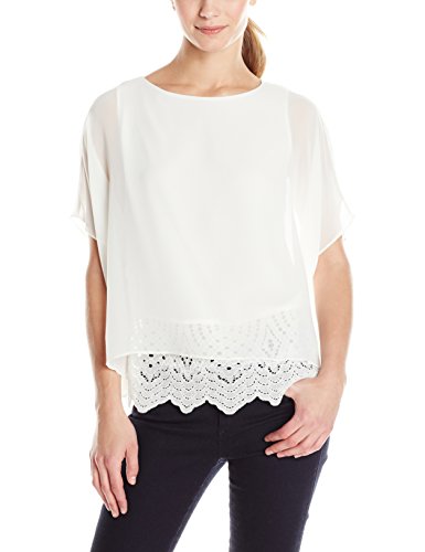 Short-sleeve top in chiffon featuring sleeveless lining with attached cutwork lace underpinning