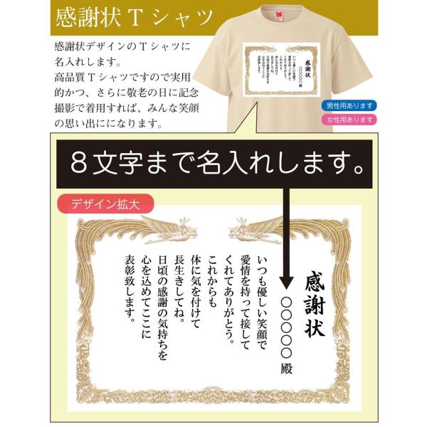 敬老の日お祝い「感謝状」デザインが人気!高品質でしっかりとした厚手生地5.6オンスのTシャツがベースで品質に自信ありです。しかも、この価格でお名前を名入れします!! 名前の文字は黒文字でプリントします。書体は筆記体となります。文字数は8文字(ひらがな・カタカナ・漢字)まで名入れいたします。 還暦祝い 父 母 プレゼント 上司 誕生日 プレゼント サプライズ 誕生日プレゼント 女性 父 母 男性 女友達 レディース メンズ 退職祝い 就任祝い 昇進祝い 歓迎会 送別会 退職祝い 勤労感謝 父プレゼント 祖父母 かんれき 父 kannreki 母 KANREKI 還暦 ちゃんちゃんこ 誕生日 おじいちゃん おばあちゃん 兄弟 母 プレゼント 誕生記念 バースデー 誕生祝い 母の日 父の日 chichinohi titinohi ちちのひ 敬老の日 かんれきいわい かんれき 父母 プレゼント 結婚記念日 いい夫婦の日 贈り物 記念品