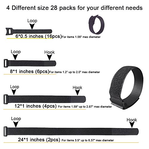 - SUPER VALUABLE SET - 4 Different size 28 packs for your different needs, the cable/cord straps come in 4 sizes: 24 x 1 INCH (2PCS), 12 x 1 INCH (4PCS), 8 x 1 INCH (6PCS), 6 x 0.5INCH (16PCS) hook and loop multipurpose strap. 2 or more straps can be combined together to extend their lengths for your special needs.