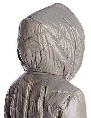 Hooded two-tone puffer coat featuring interior vestee with funnel collar and channel-quilt outer shell with rail-stitching at waist