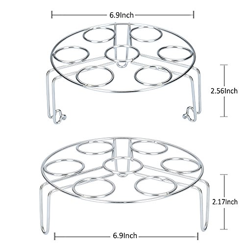 Stackable Type: the upper one(6.9x6.9x2.56 in)has grooved legs to make them stay firmly on the lower one (6.9x6.9x2.17 in), so you can boil at most 14 eggs at the same time in a few minutes, and easily keep eggs stay put in your instant pot, pressure cooker and other pots, never broke the eggs again.