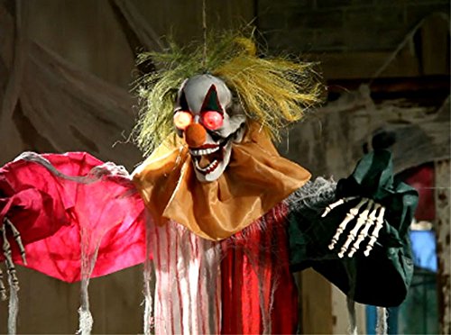 -. Brand : FX -. Color : Multi -. EAN : 0635323998194 -. Feature : Hangs approx. 6 ft. x 54" with arms outstretched / Flashing red eyes / Requires 2 "AA" batteries, not included -. Label : FX -. Manufacturer : FX -. ProductGroup : Lawn & Patio -. ProductTypeName : OUTDOOR_LIVING -. Publisher : FX -. Studio : FX -. Title : Hanging Evil CLOWN Flashing LED Eyes Poseable Halloween Yard Outside Lawn Decor -. UPC : 635323998194