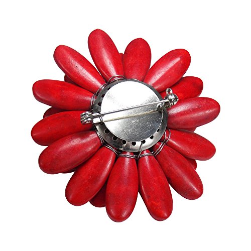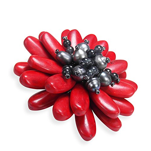-. Feature : Material: Base metal | Trademark: Not stamped | Stone: Reconstructed red coral, Cultured freshwater pearl (dyed), Synthetic smokey quartz / Flower Measurements: 72 mm (2.83 in) diameter / Color: Red-Black | Weight: 52.5 grams / Style: Handmade, Pin/Brooch, Floral / Includes an official 'AERAVIDA Fair Trade Sourcing' Card with certified Seal of Authenticity.