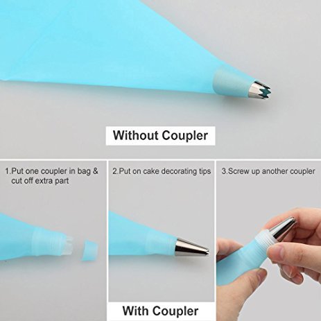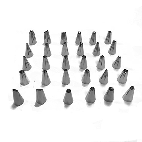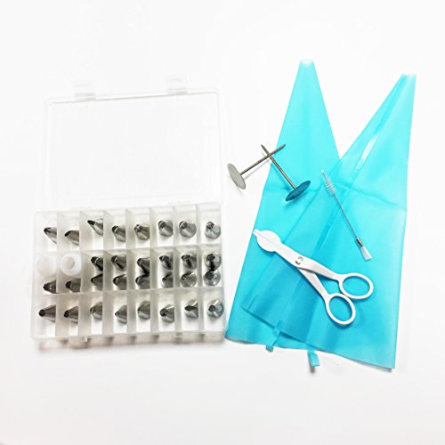 - Cake decorating supplies kits: 30 stainless steel icing tips, 2 reusable silicone pastry bag, 2 reusable plastic couplers, 2 flower nails, 1 Cleaning Brush with which you can create all types of patterns on cake, cupcakes.
