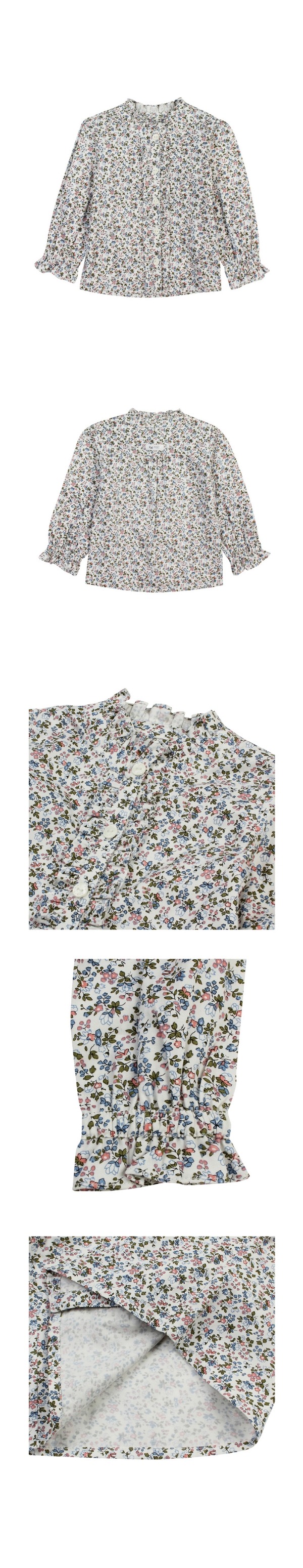 소매단과 네트라인에 프릴장식을 주어 로맨틱한 느낌을 주는 플라워 프린트 여아 블라우스.