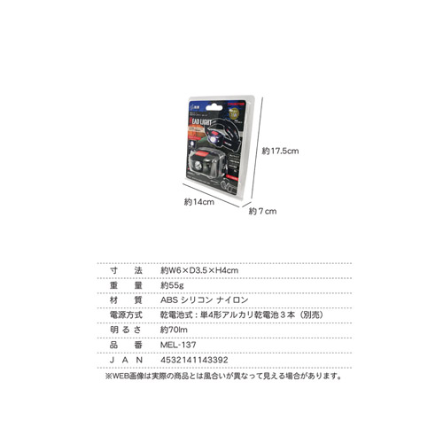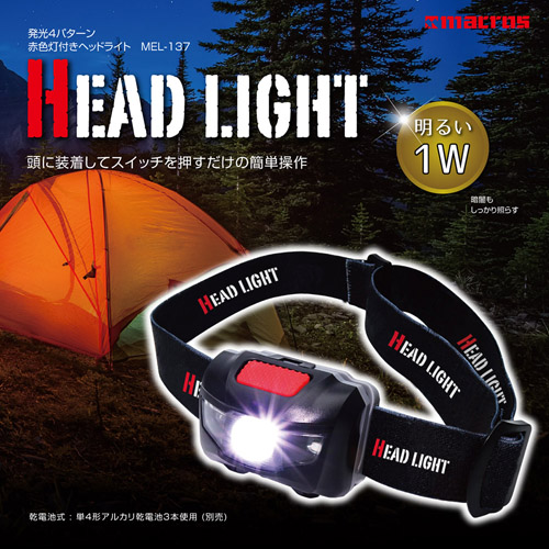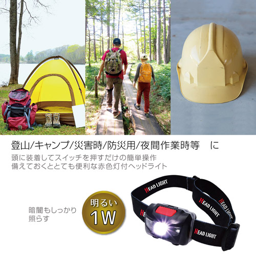 ●頭に装着してスイッチを押すだけの簡単操作のヘッドライト!点灯(強、弱、赤色灯)、点滅(赤色灯)の発光4パターン
